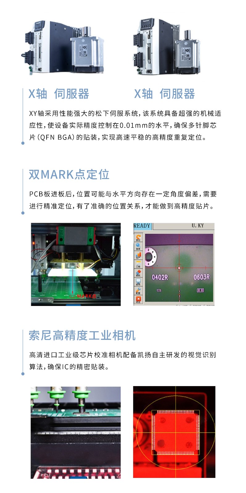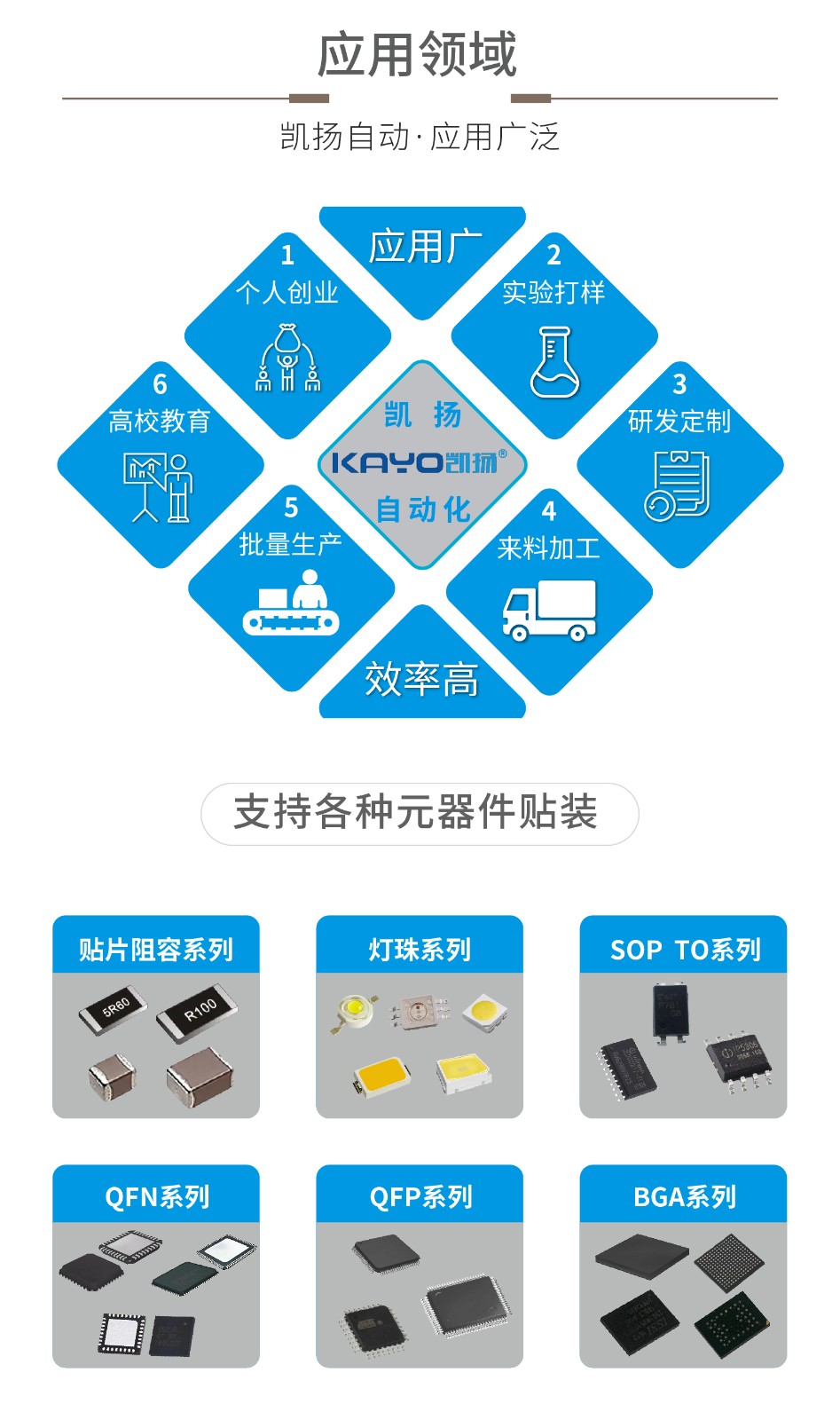 适用贴装范围 | 适配0201、0402、0603、0805、1206、LED灯珠、二极管、三极管、SOT、45*45mm范围内引脚间距大于0.3mm的QFP、BGA等 |