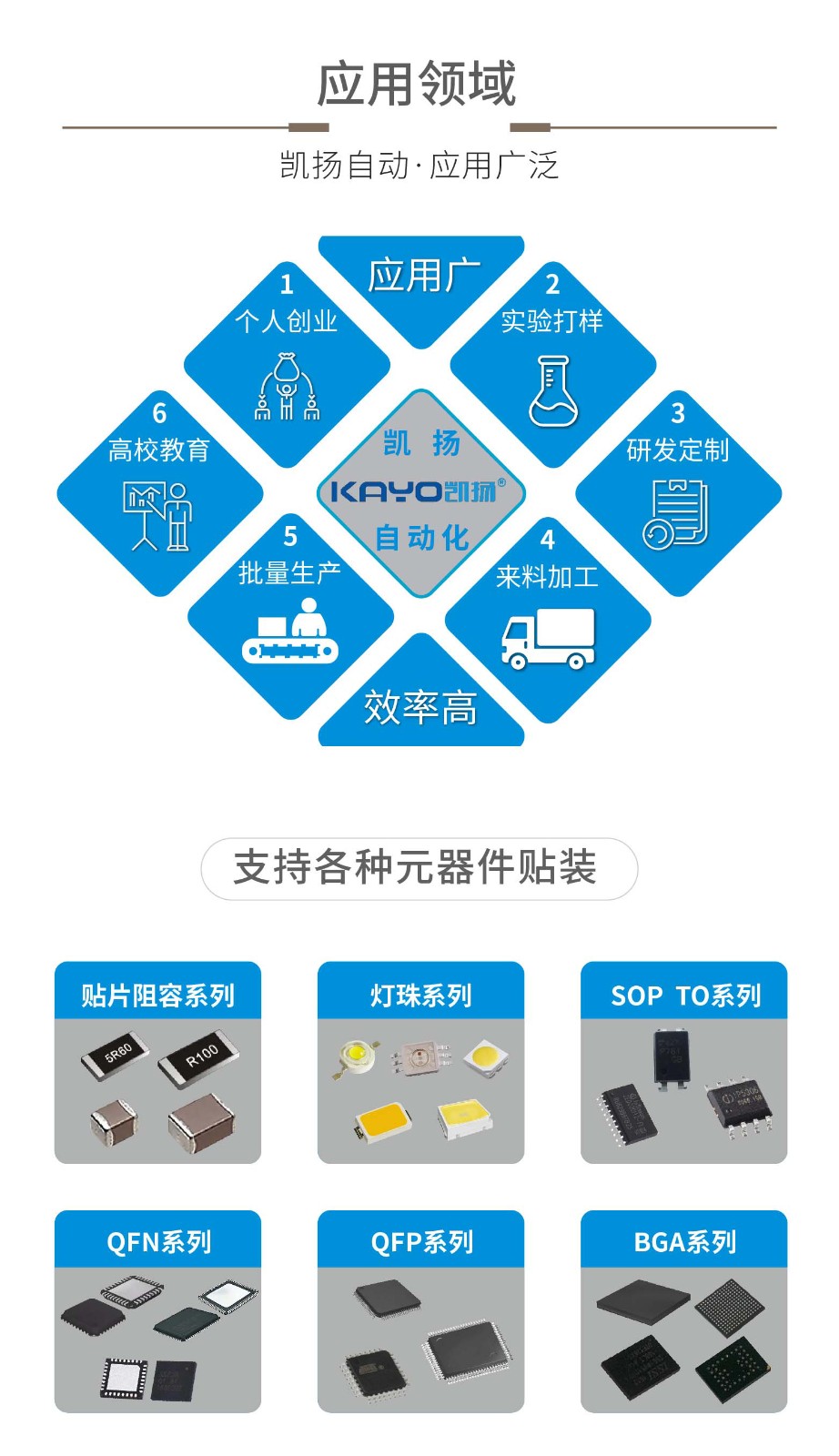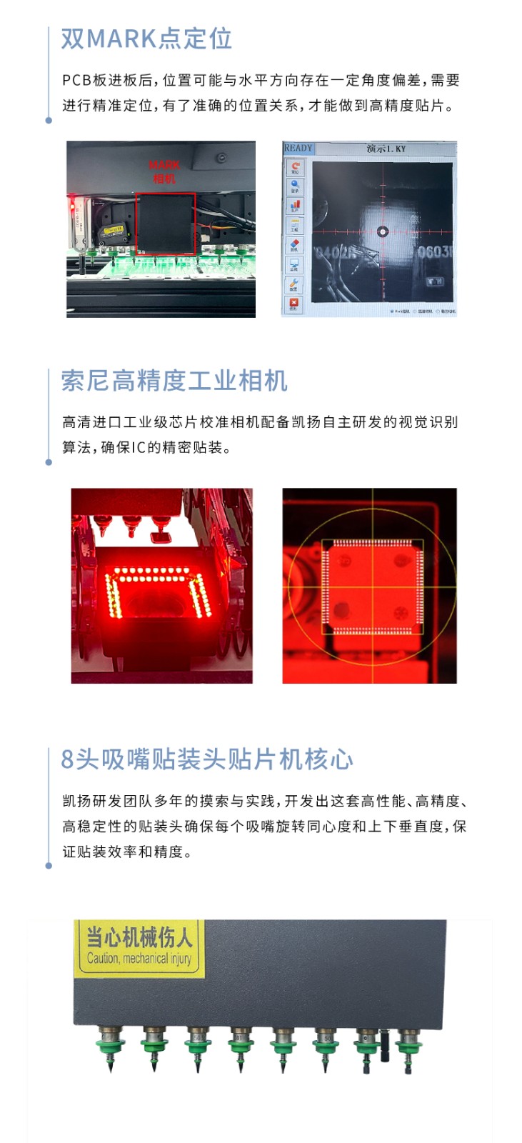 适用贴装范围适配0201、0402、0603、0805、1206、LED灯珠、二极管、SOT、45*45mm范围内引脚间距大于0.3mm的QFP、BGA等